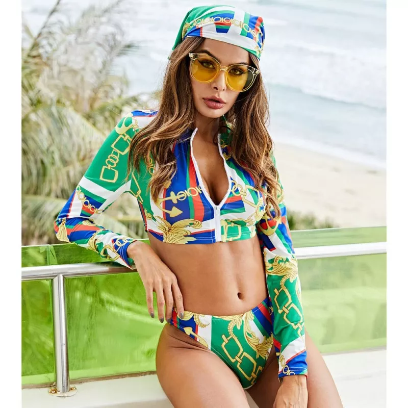 3-Piece Long-Sleeved Zip-Up Two-Piece Swimsuit in Green and Blue